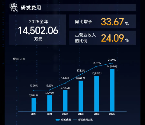 2025年,鼎陽科技全年研發(fā)投入高達(dá)14,502.06萬元,同比增長(zhǎng)33.67%,占營(yíng)業(yè)收入的比例達(dá)到24.09%,同比提升2.28個(gè)百分點(diǎn)。持續(xù)的研發(fā)高投入為鼎陽科技帶來了豐碩的技術(shù)成果與產(chǎn)品回報(bào)。
