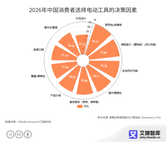 在消費者決策層面,耐用性/故障率(34.71%)、續(xù)航能力(32.90%)、安全防護功能(32.39%) 成為用戶選擇電動工具時最關(guān)注的三大因素;同時操作便捷性、售后服務(wù)與產(chǎn)品價格也占據(jù)較高權(quán)重。這意味著,品質(zhì)可靠、性能穩(wěn)定、安全易用的產(chǎn)品,將更易獲得市場青睞,也為行業(yè)指明了技術(shù)與產(chǎn)品迭代的核心方向。