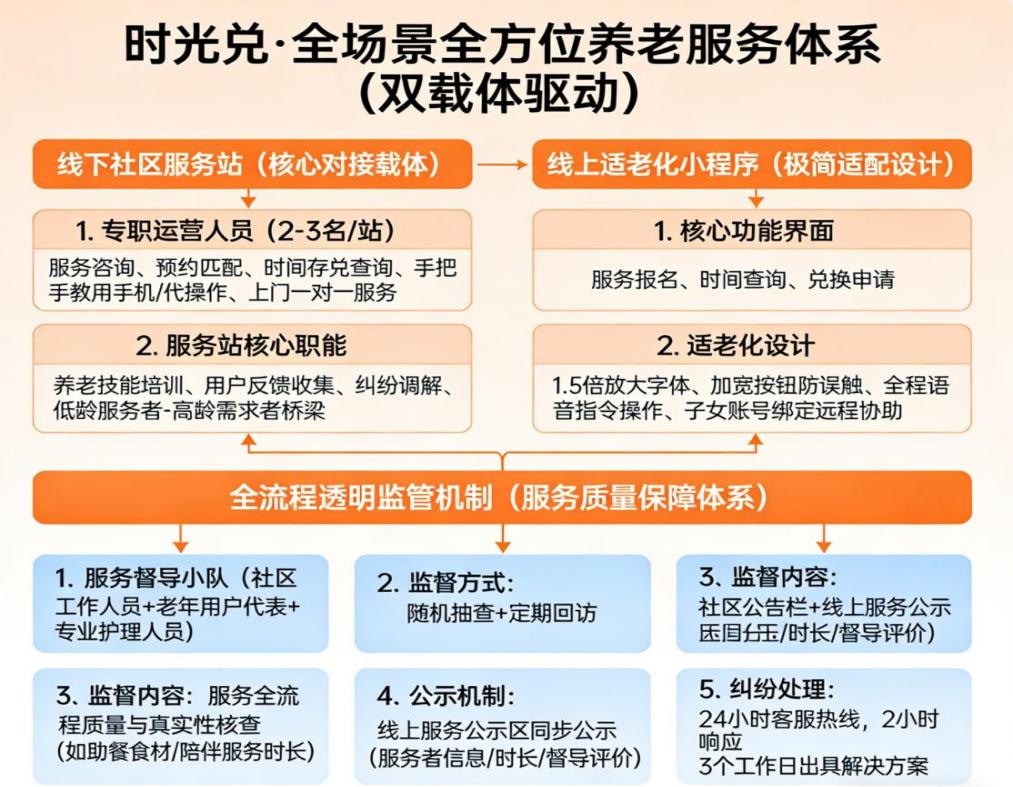 立足我國(guó)養(yǎng)老服務(wù)領(lǐng)域的現(xiàn)實(shí)需求,時(shí)光兌·養(yǎng)老互助平臺(tái)精準(zhǔn)對(duì)接國(guó)家養(yǎng)老服務(wù)相關(guān)政策導(dǎo)向,深度融合“時(shí)間存兌”機(jī)制與大數(shù)據(jù)、區(qū)塊鏈、人工智能等智慧技術(shù),精心打造“線上+線下”一體化養(yǎng)老服務(wù)體系。與傳統(tǒng)養(yǎng)老服務(wù)模式相比,該平臺(tái)以“時(shí)間幣”為核心紐帶,建立起“付出即積累、積累可兌換”的規(guī)范化互助機(jī)制,有效打破了養(yǎng)老服務(wù)的時(shí)空限制,激活了社會(huì)各界參與養(yǎng)老服務(wù)的內(nèi)生動(dòng)力,拓寬了養(yǎng)老服務(wù)供給渠道。