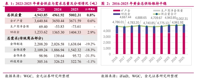 黃金的供給量穩(wěn)定。雖在 2025 年創(chuàng)下 3672 噸的歷史新高,但金礦產(chǎn)量同比僅增長 1%,事實(shí)上黃金供應(yīng)量特別是開采量很難因金價波動而即時調(diào)整,較為穩(wěn)定;且盡管金價 2025 年表現(xiàn)亮眼,但回收金供應(yīng)量僅溫和增長了 3%。