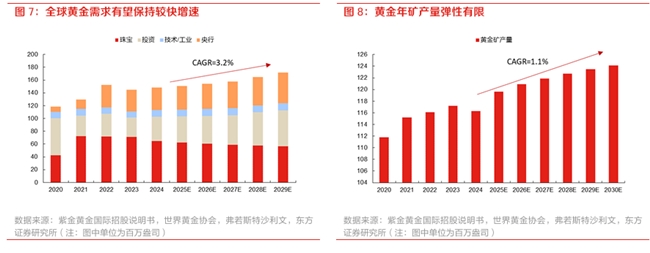 地緣風(fēng)險(xiǎn)推動通脹上行,將拉動黃金為代表的避險(xiǎn)資產(chǎn)需求邊際增強(qiáng),但黃金礦產(chǎn)量增速彈性有限。黃金是全世界公認(rèn)的避險(xiǎn)資產(chǎn),具有價值相對穩(wěn)定、流動性強(qiáng)、抗通脹的特性。2024年全球黃金需求量約為 148.1 百萬盎司,在投資需求、央行購金需求的帶動下,2024年至2029年間全球黃金需求有望維持較快增速,復(fù)合增速達(dá)到 3.2%。但黃金礦產(chǎn)量增長彈性是相對有限的,2024年全球黃金礦產(chǎn)量為 116.3 百萬盎司,對比同年黃金需求量存在31.8百萬盎司的供給缺口。2024 年至2030年全球黃金礦產(chǎn)量復(fù)合增速僅為1.1%,低于黃金需求增速。