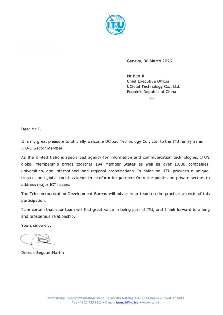 ITU發(fā)函歡迎優(yōu)刻得成為成員單位