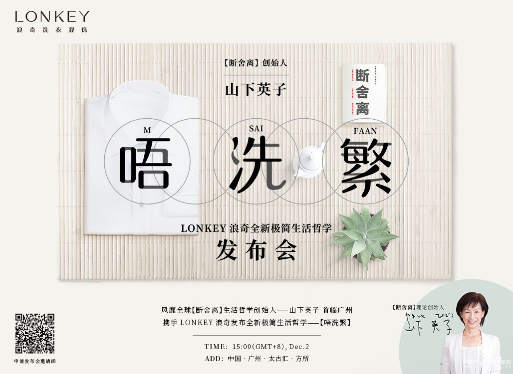 2017年12月2日,全新極簡生活哲學(xué)「唔(M)洗(SAI)繁(FAAN)」的發(fā)布會(huì)將在廣州方所舉行。發(fā)布會(huì)上,【斷舍離】的創(chuàng)始人山下英子女士將出任LONKEY浪奇首席生活哲學(xué)官。本次發(fā)布會(huì)將在現(xiàn)場詮釋全新的極簡生活哲學(xué)「唔洗繁」,將同時(shí)通過全息投影等技術(shù),向大家展現(xiàn)純粹生活之美。