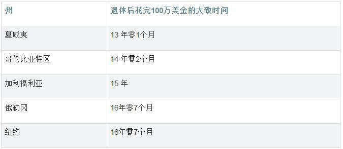 下表列出了100萬美元可供花銷時間最長的前五個州: