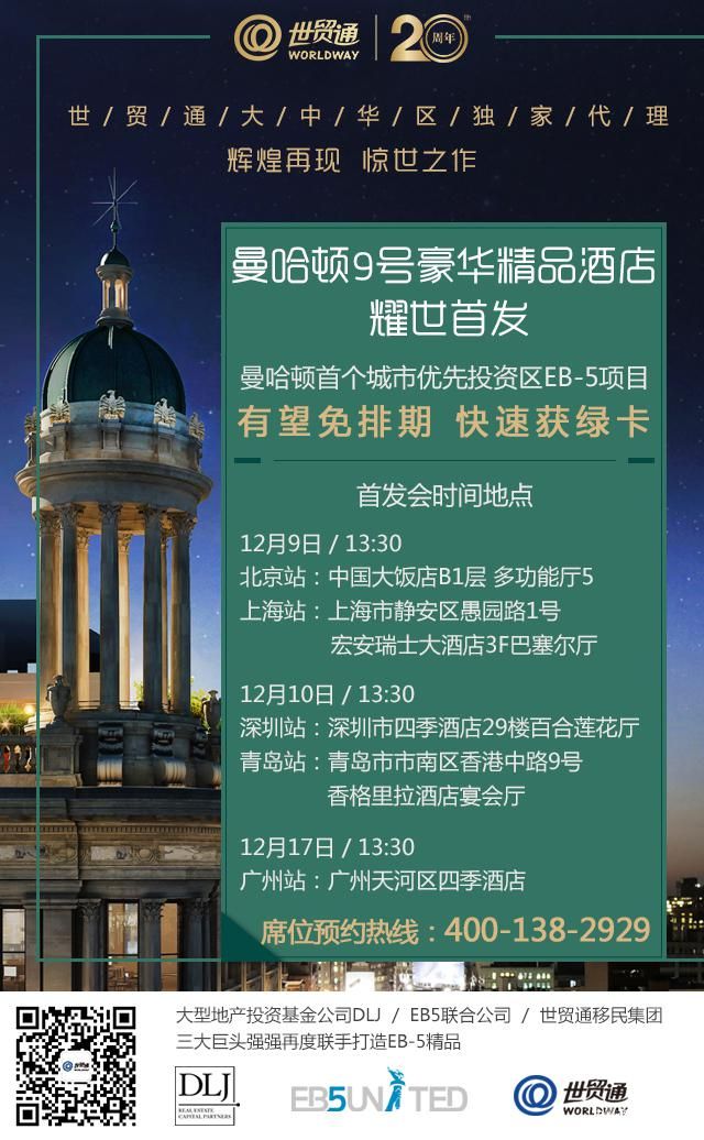 有望免排期,快速獲綠卡!曼哈頓首個城市優(yōu)先區(qū)的EB-5項目全國耀世首發(fā)會,將在北京、上海、深圳、青島、廣州等多個城市隆重舉行。屆時,項目開發(fā)商、EB-5權威律師及美方高層將親臨現(xiàn)場,為投資人帶來項目第一手資訊。敬請預約參與,速搶珍稀名額!