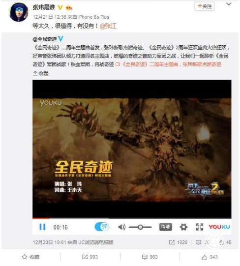 張瑋微博發(fā)布《全民奇跡Mu》兩周年主題曲