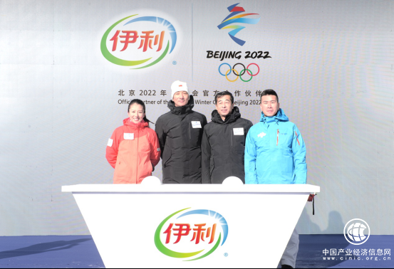 圖說:冬奧組委市場開發(fā)部副部長顧灝寧、伊利集團執(zhí)行總裁張劍秋、冬奧冠軍楊揚和韓曉鵬共同啟動伊利-冬奧組合標識發(fā)布儀式。