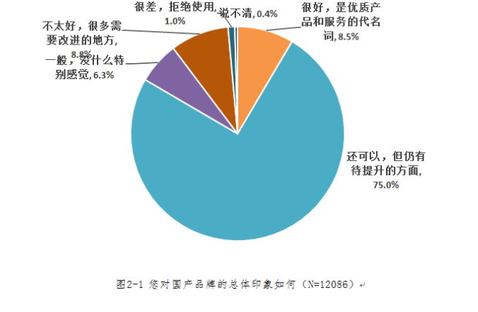 盡管國產(chǎn)品牌越來越受消費(fèi)者青睞,但根據(jù)調(diào)查能看出消費(fèi)者對(duì)國產(chǎn)品牌的總體印象仍然不高,大多數(shù)(約75%)認(rèn)為國產(chǎn)品牌“還可以、仍需提升。”