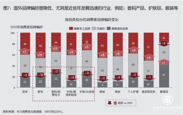 在2015年BCG(波士頓咨詢公司)做的一項(xiàng)心理調(diào)查,當(dāng)年我國新興消費(fèi)群體對(duì)國產(chǎn)品牌的接受度相比2007年總體提升了7%,約40%的人更喜歡本土品牌。