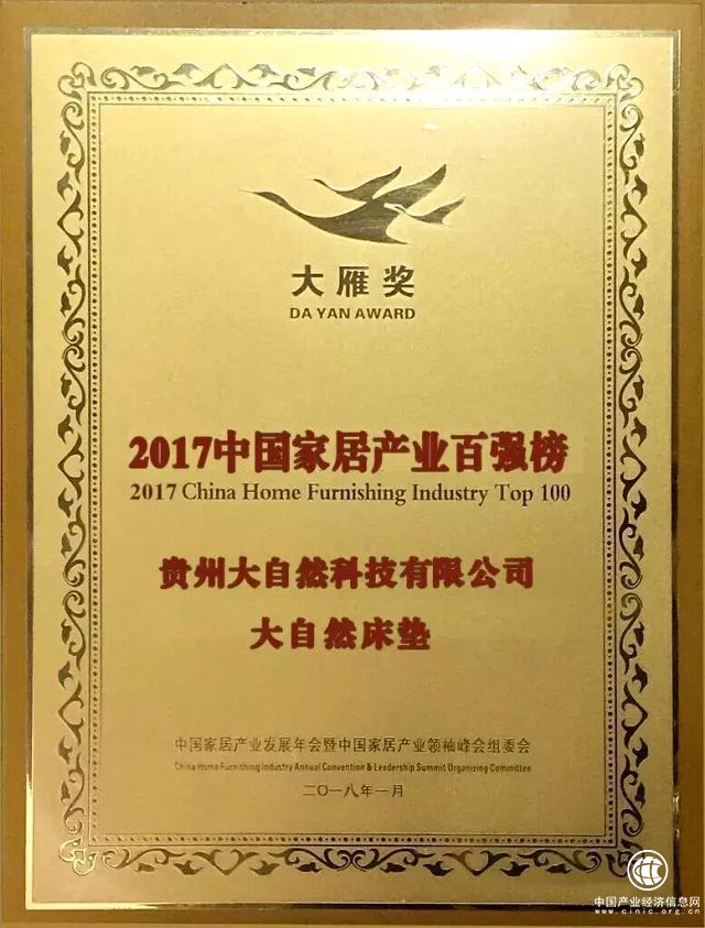 2018年1月6日,在家居行業(yè)有著“奧斯卡”美譽,行業(yè)最具影響力、最具關注度——中國家居產業(yè)百強榜 “大雁獎”頒獎盛典在北京·國家會議中心隆重召開。大自然棕床墊憑借其良好的品牌形象和行業(yè)領先地位再獲“2017年度中國家居產業(yè)百強榜”殊榮!