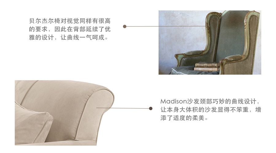 貝爾杰爾椅深受貴婦們喜愛的另一原因正是它精細的材質(zhì)。坐面通常采用較厚的彈性坐墊,通體用華麗的織綿加以包面,而填充的材料多為珍稀的羽毛。如此完美的搭配給予了Madison Sofa在選材上的靈感。