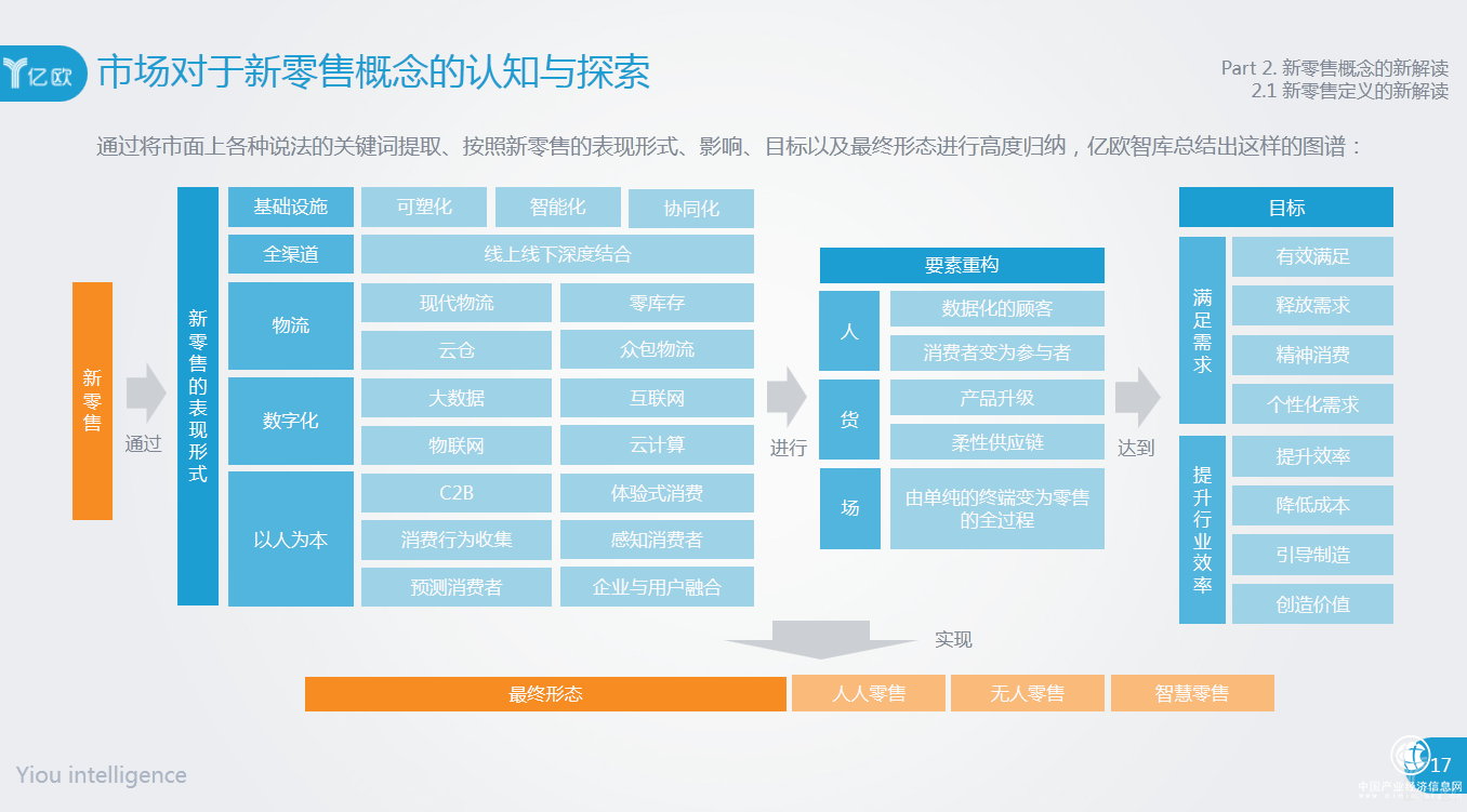 “新零售”這一專有名詞,由馬云在2016年10月份提出,2017年被稱為“新零售元年”。市場上對于新零售的理解各不相同,通過將市面上各種說法的關(guān)鍵詞提取、按照新零售的表現(xiàn)形式、影響、目標(biāo)以及最終形態(tài)進(jìn)行高度歸納,億歐智庫總結(jié)出這樣的圖譜: