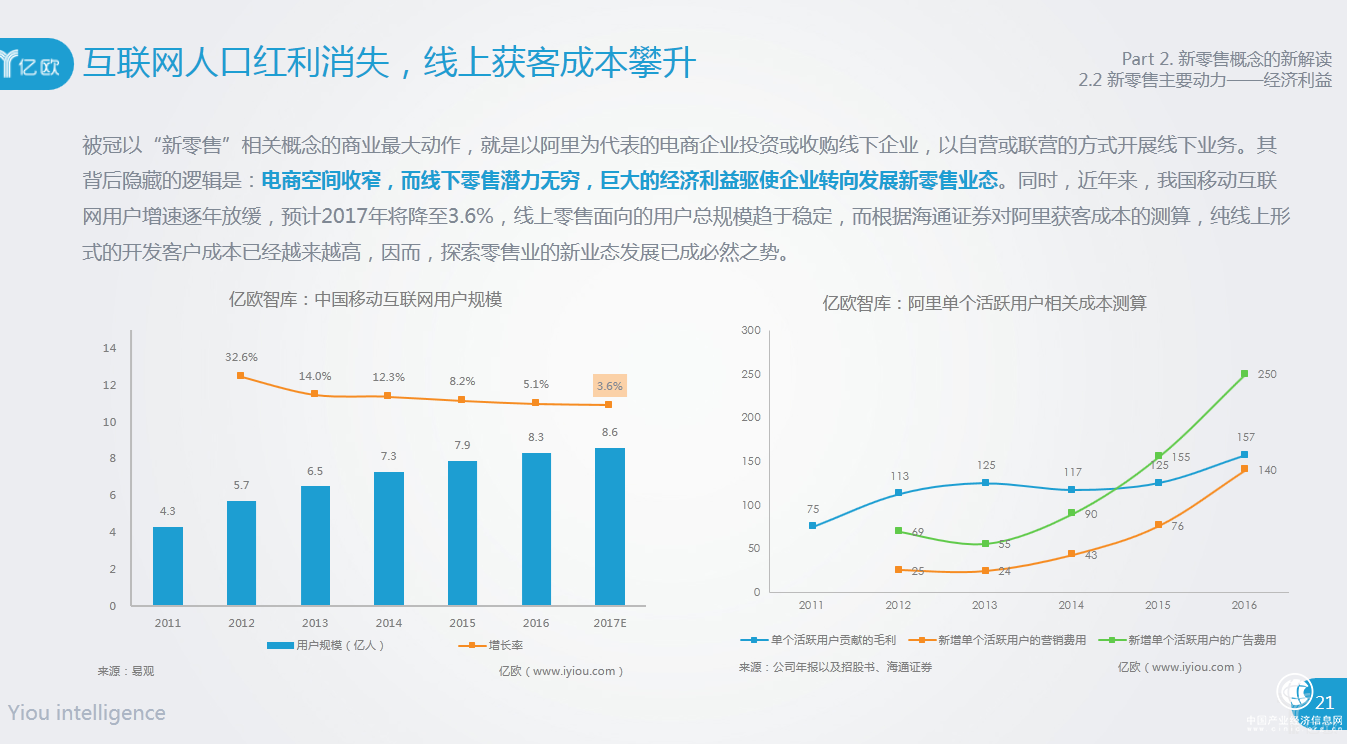 被冠以“新零售”相關(guān)概念的商業(yè)最大動作,就是以阿里為代表的電商企業(yè)投資或收購線下企業(yè),以自營或聯(lián)營的方式開展線下業(yè)務(wù)。其背后隱藏的邏輯是:電商空間收窄,而線下零售潛力無窮,巨大的經(jīng)濟(jì)利益驅(qū)使企業(yè)轉(zhuǎn)向發(fā)展新零售業(yè)態(tài)。同時,近年來,我國移動互聯(lián)網(wǎng)用戶增速逐年放緩,預(yù)計2017年將降至3.6%,線上零售面向的用戶總規(guī)模趨于穩(wěn)定,而根據(jù)海通證券對阿里獲客成本的測算,純線上形式的開發(fā)客戶成本已經(jīng)越來越高,因而,探索零售業(yè)的新業(yè)態(tài)發(fā)展已成必然之勢。
