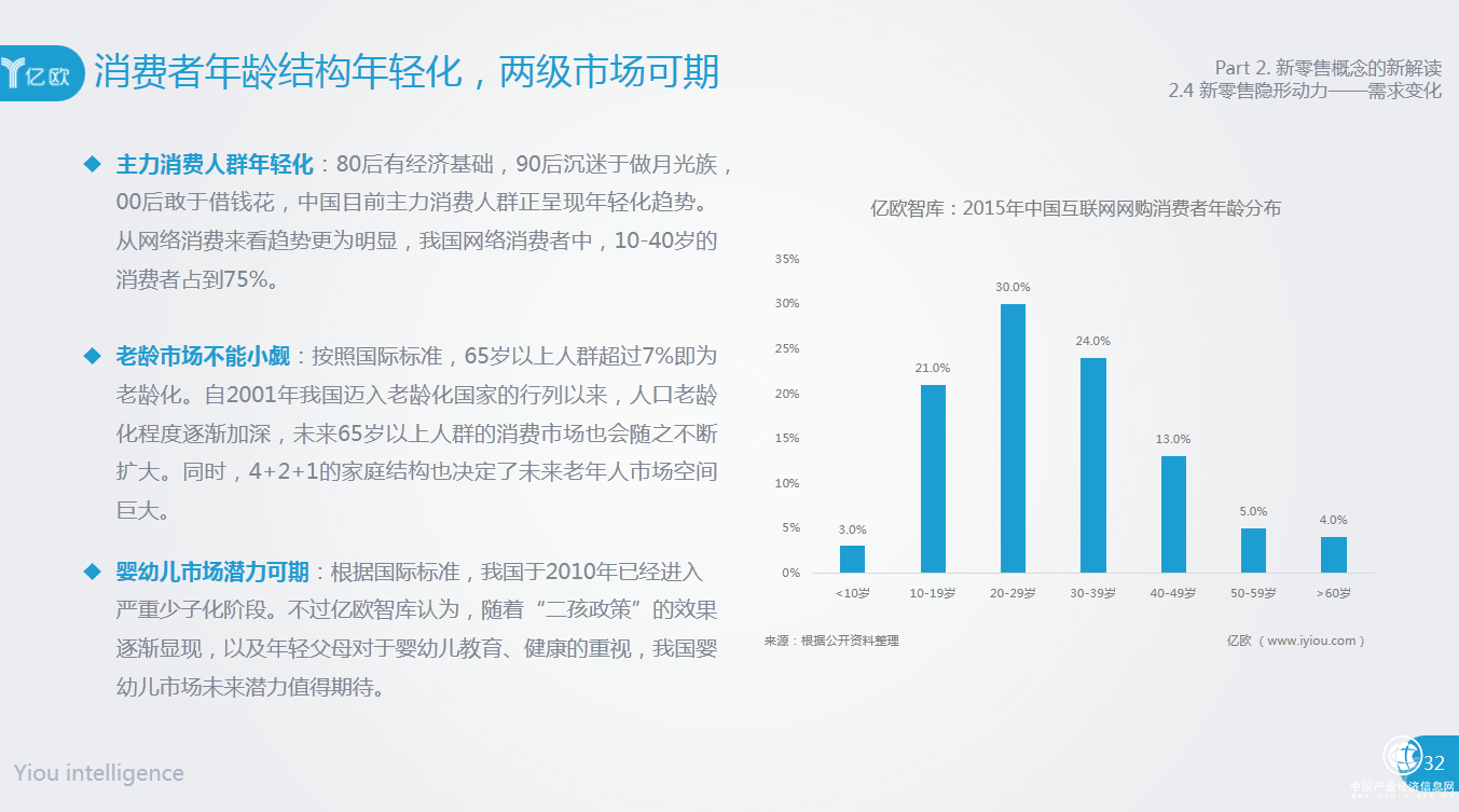 消費(fèi)需求是新零售的牽引力,消費(fèi)者的變化代表著市場的變化,自然也是新零售所要跟隨的趨勢。消費(fèi)者變化主要體現(xiàn)在消費(fèi)者結(jié)構(gòu)變化、消費(fèi)升級帶來的消費(fèi)需求和偏好變化。其中,消費(fèi)者結(jié)構(gòu)變化包括消費(fèi)者年齡結(jié)構(gòu)以及地理結(jié)構(gòu)的變化。