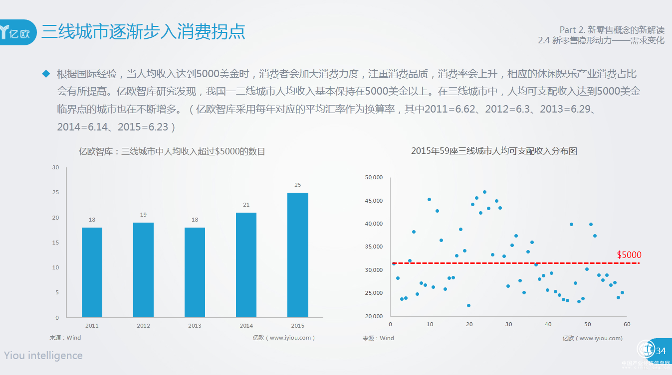 根據(jù)國際經(jīng)驗,當(dāng)人均收入達(dá)到5000美金時,消費(fèi)者會加大消費(fèi)力度,注重消費(fèi)品質(zhì),消費(fèi)率會上升,相應(yīng)的休閑娛樂產(chǎn)業(yè)消費(fèi)占比會有所提高。億歐智庫研究發(fā)現(xiàn),我國一二線城市人均收入基本保持在5000美金以上。在三線城市中,人均可支配收入達(dá)到5000美金臨界點的城市也在不斷增多。(億歐智庫采用每年對應(yīng)的平均匯率作為換算率,其中2011=6.62、2012=6.3、2013=6.29、2014=6.14、2015=6.23)