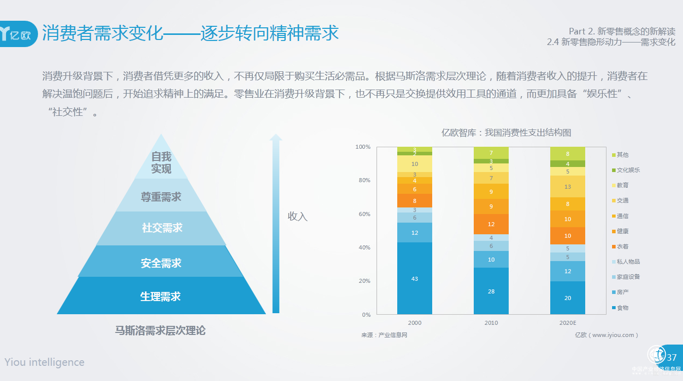 消費(fèi)升級背景下,消費(fèi)者借憑更多的收入,不再僅局限于購買生活必需品。根據(jù)馬斯洛需求層次理論,隨著消費(fèi)者收入的提升,消費(fèi)者在解決溫飽問題后,開始追求精神上的滿足。零售業(yè)在消費(fèi)升級背景下,也不再只是交換提供效用工具的通道,而更加具備“娛樂性”、“社交性”。