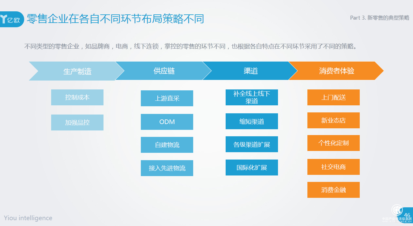 不同類型的零售企業(yè),如品牌商,電商,線下連鎖,掌控的零售的環(huán)節(jié)不同,也根據(jù)各自特點在不同環(huán)節(jié)采用了不同的策略。