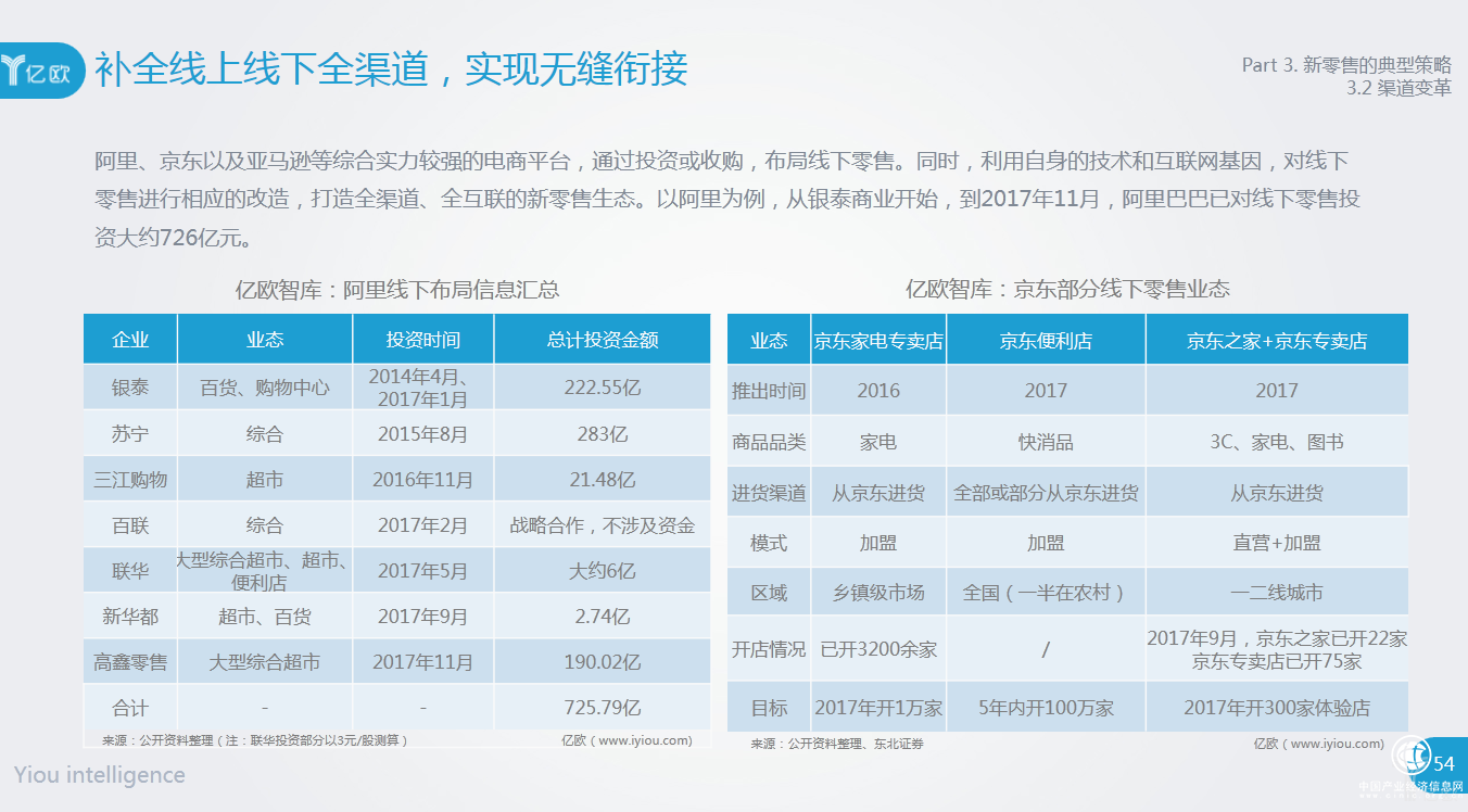 阿里、京東以及亞馬遜等綜合實力較強(qiáng)的電商平臺,通過投資或收購,布局線下零售。同時,利用自身的技術(shù)和互聯(lián)網(wǎng)基因,對線下零售進(jìn)行相應(yīng)的改造,打造全渠道、全互聯(lián)的新零售生態(tài)。以阿里為例,從銀泰商業(yè)開始,到2017年11月,阿里巴巴已對線下零售投資大約726億元。