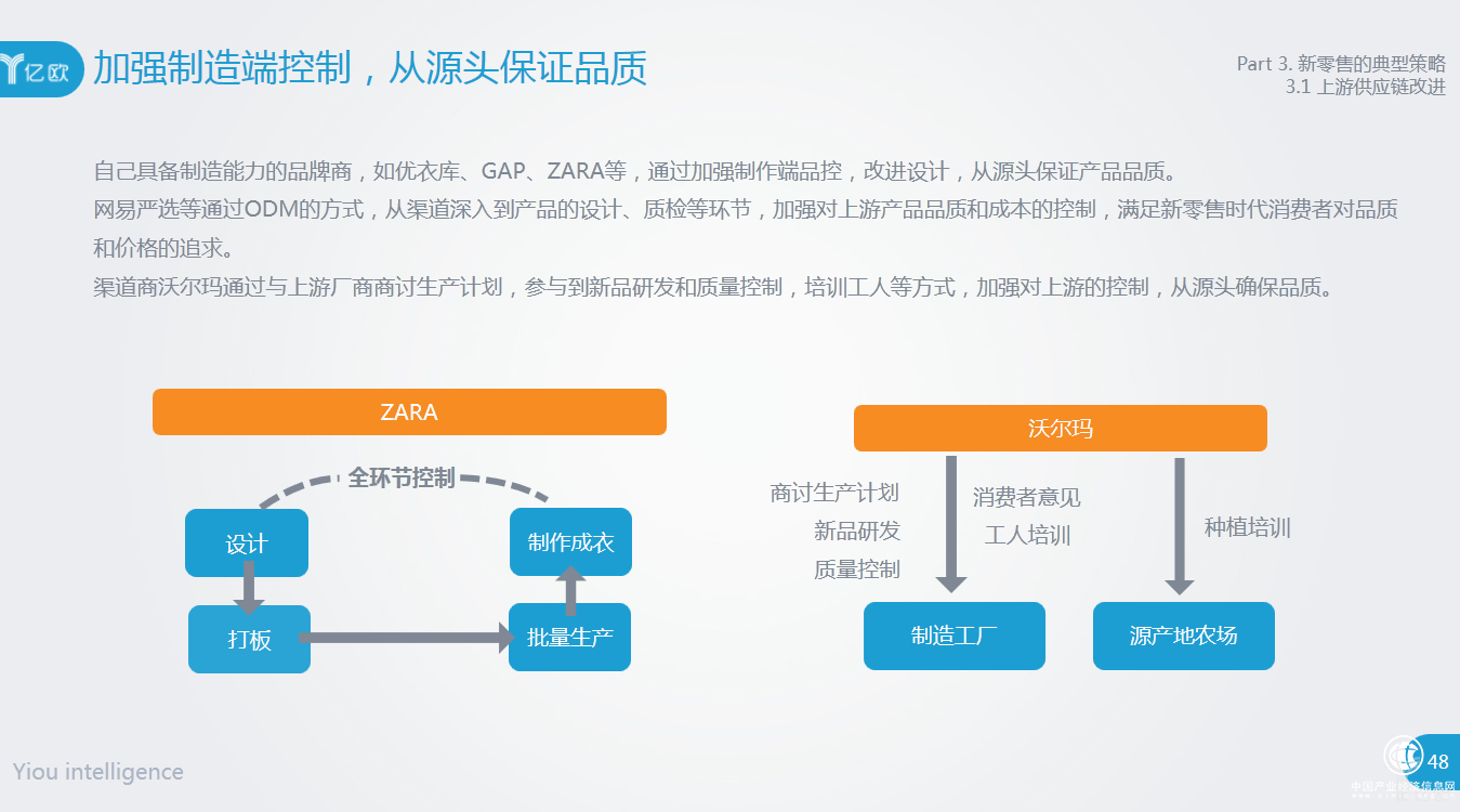 自己具備制造能力的品牌商,如優(yōu)衣庫、GAP、ZARA等,通過加強(qiáng)制作端品控,改進(jìn)設(shè)計,從源頭保證產(chǎn)品品質(zhì)。網(wǎng)易嚴(yán)選等通過ODM的方式,從渠道深入到產(chǎn)品的設(shè)計、質(zhì)檢等環(huán)節(jié),加強(qiáng)對上游產(chǎn)品品質(zhì)和成本的控制,滿足新零售時代消費(fèi)者對品質(zhì)和價格的追求。