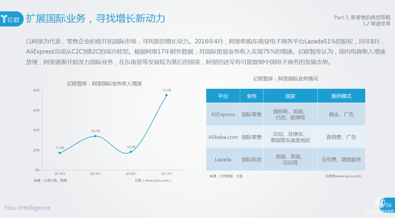 以阿里為代表,零售企業(yè)積極開拓國際市場,尋找新的增長動力。2016年4月,阿里收購東南亞電子商務(wù)平臺Lazada51%的股權(quán),同年8月,AliExpress完成從C2C到B2C的成功轉(zhuǎn)型。根據(jù)阿里17年財務(wù)數(shù)據(jù),其國際貿(mào)易業(yè)務(wù)收入實現(xiàn)75%的增速。億歐智庫認(rèn)為,國內(nèi)電商收入增速放緩,阿里逐漸開始發(fā)力國際業(yè)務(wù),在東南亞等發(fā)展較為落后的國家,阿里的進(jìn)軍有可能復(fù)制中國電子商務(wù)的發(fā)展態(tài)勢。