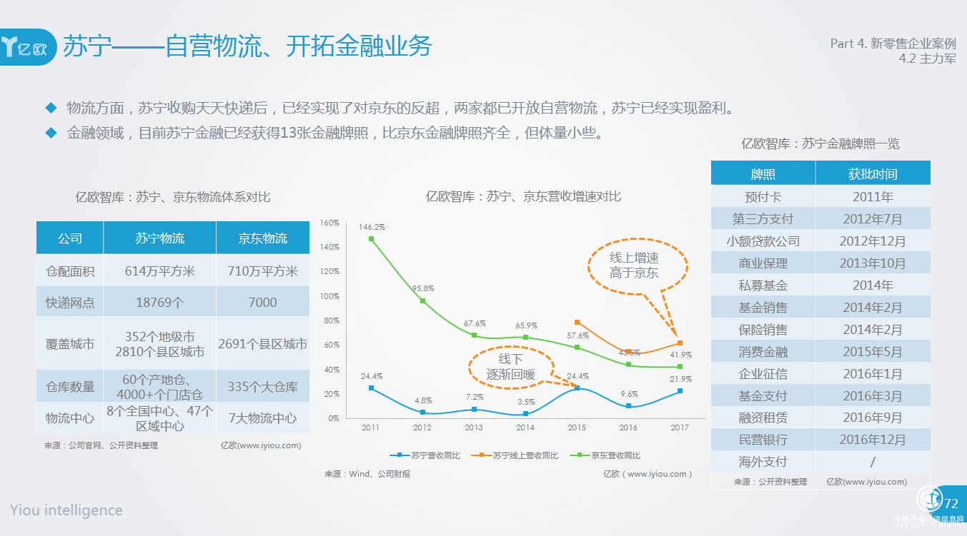 物流方面,蘇寧收購天天快遞后,已經(jīng)實現(xiàn)了對京東的反超,兩家都已開放自營物流,蘇寧已經(jīng)實現(xiàn)盈利。金融領(lǐng)域,目前蘇寧金融已經(jīng)獲得13張金融牌照,比京東金融牌照齊全,但體量小些。