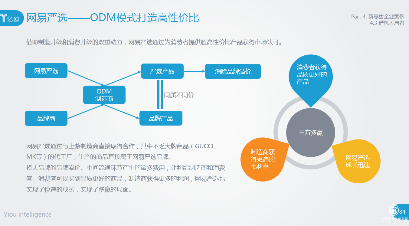 網(wǎng)易嚴(yán)選——ODM模式打造高性價比。網(wǎng)易嚴(yán)選通過與上游制造商直接取得合作,其中不乏大牌商品(GUCCI、MK等)的代工廠,生產(chǎn)的商品直接屬于網(wǎng)易嚴(yán)選品牌。通過將大品牌的品牌溢價、中間流通環(huán)節(jié)產(chǎn)生的諸多費(fèi)用,讓利給制造商和消費(fèi)者。消費(fèi)者可以買到品質(zhì)更好的商品,制造商獲得更多的利潤,網(wǎng)易嚴(yán)選也實現(xiàn)了快速的成長,實現(xiàn)了多贏的局面。
