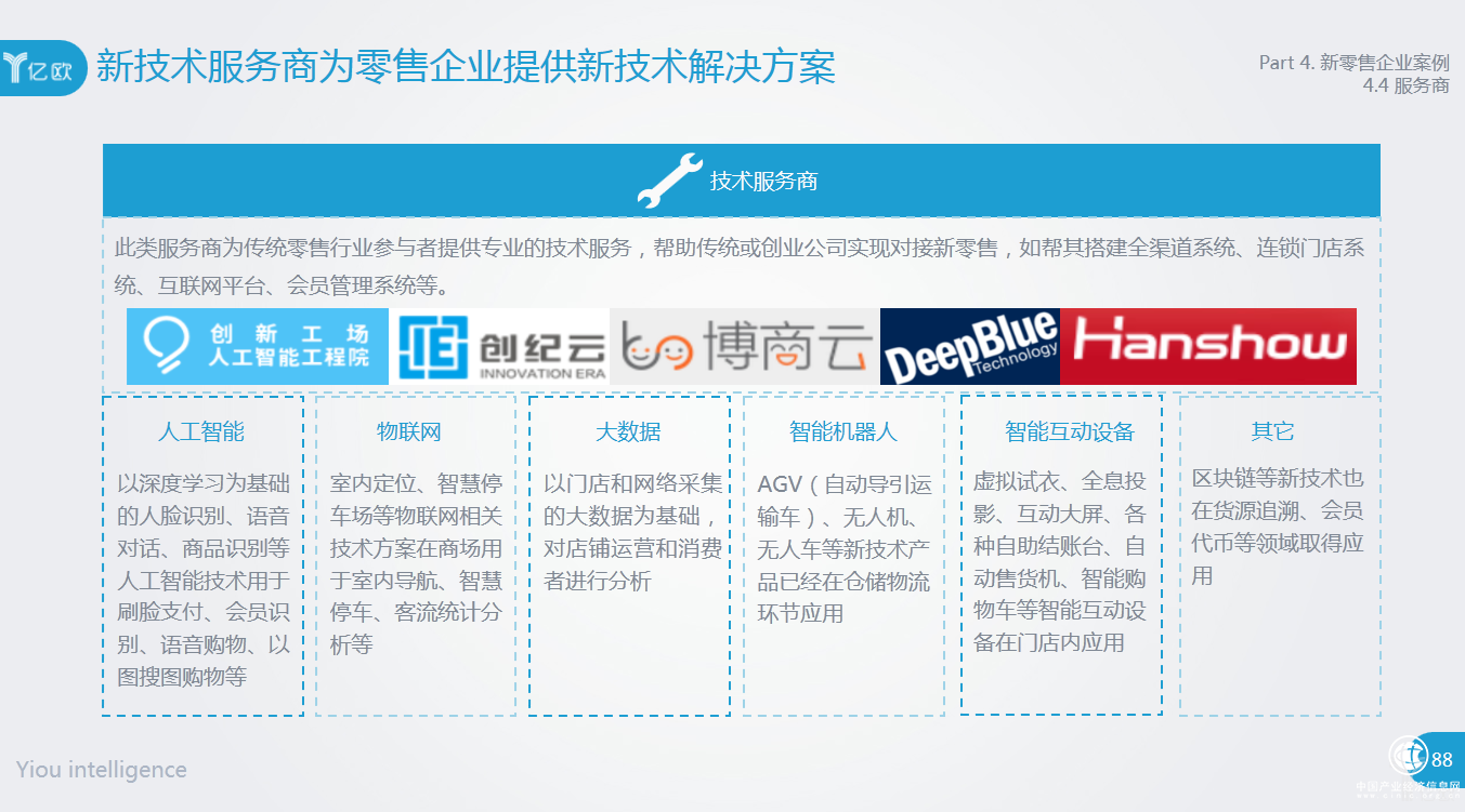 新技術(shù)服務(wù)商為傳統(tǒng)零售行業(yè)參與者提供專業(yè)的技術(shù)服務(wù),幫助傳統(tǒng)或創(chuàng)業(yè)公司實現(xiàn)對接新零售,如幫其搭建全渠道系統(tǒng)、連鎖門店系統(tǒng)、互聯(lián)網(wǎng)平臺、會員管理系統(tǒng)等。