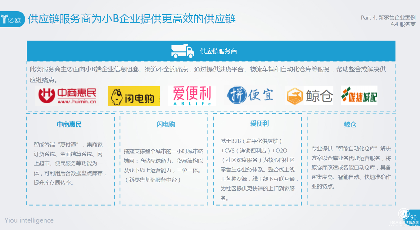 供應(yīng)鏈服務(wù)商主要面向小B端企業(yè)信息阻塞、渠道不全的痛點,通過提供進(jìn)貨平臺、物流車輛和自動化倉庫等服務(wù),幫助整合或解決供應(yīng)鏈痛點。