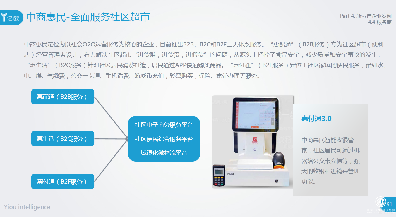 中商惠民定位為以社會O2O運(yùn)營服務(wù)為核心的企業(yè),目前推出B2B、B2C和B2F三大體系服務(wù)。“惠配通”(B2B服務(wù))專為社區(qū)超市(便利店)經(jīng)營管理者設(shè)計,著力解決社區(qū)超市“進(jìn)貨難,進(jìn)貨貴,進(jìn)假貨”的問題,從源頭上把控了食品安全,減少質(zhì)量和安全事故的發(fā)生。“惠生活”(B2C服務(wù))針對社區(qū)居民消費(fèi)打造,居民通過APP快速購買商品。“惠付通”(B2F服務(wù))定位于社區(qū)家庭的便民服務(wù),諸如水、電、煤、氣繳費(fèi),公交一卡通、手機(jī)話費(fèi)、游戲幣充值,彩票購買,保險、寬帶辦理等服務(wù)。
