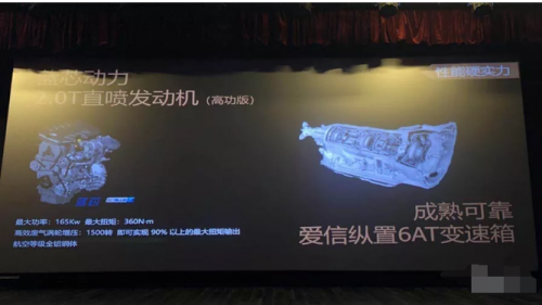 動(dòng)力搭載一臺(tái)代號(hào)為20L4E的藍(lán)芯動(dòng)力2.0T直噴發(fā)動(dòng)機(jī),最大功率為最大功率165Kw,最大扭矩360N·m。傳動(dòng)系統(tǒng)方面,匹配來(lái)自愛(ài)信縱置6AT變速箱。