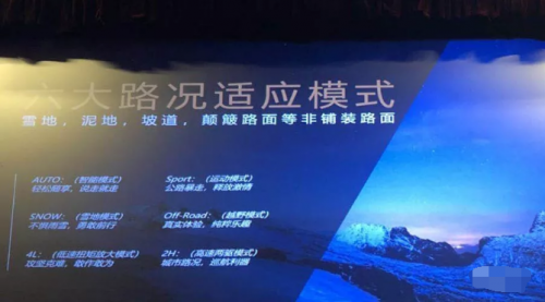 共集成了6種模式:Auto智能模式、Sport運(yùn)動(dòng)模式、Snow雪地模式、Off-road越野模式、4L低扭矩放大模式、2H高速兩驅(qū)模式。