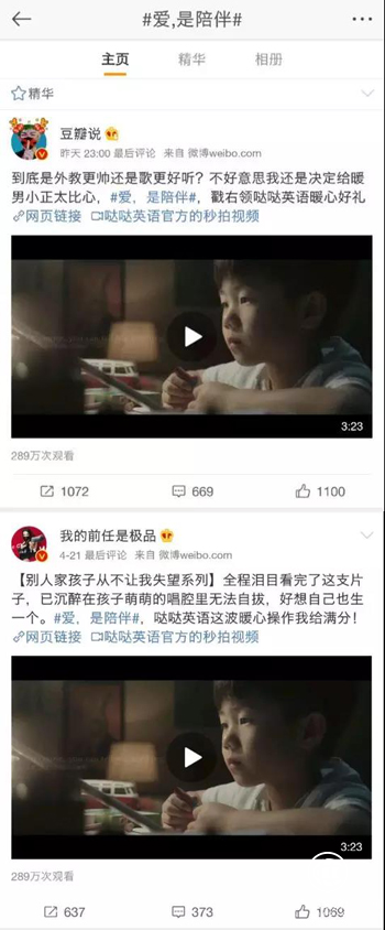什么是城市父母在子女教育中最大的痛點(diǎn)?當(dāng)忙碌的工作擠占了本該陪伴孩子的時間,當(dāng)繁雜瑣碎的日常打擾了陪伴孩子的情緒,這些在城市中扮演精英白領(lǐng)角色的爸爸媽媽們,一直愧疚于缺席孩子的成長和教育。在深刻洞察80、90后城市父母痛點(diǎn)的基礎(chǔ)上,主打“一對一固定外教”在線教學(xué)模式的噠噠英語,融入了“陪伴”理念,將本輪傳播話題定為“愛,是陪伴”,以情感共鳴深度喚醒目標(biāo)用戶群。而在話題傳播上,選擇了不同類型的微博紅人進(jìn)行情感傳遞。