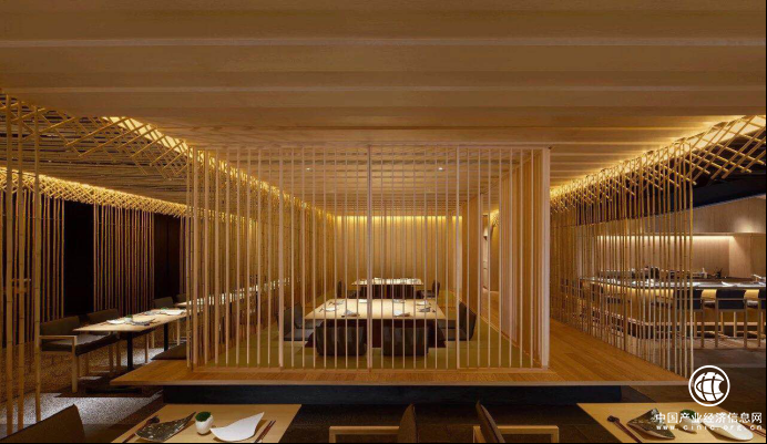 纖纖細(xì)竹交織成天花和屏風(fēng),在精心鋪設(shè)的藏?zé)舻妮x映下,呈現(xiàn)出簡約而多變的圖案。線條流利的木質(zhì)餐桌上擺放著如折紙般精巧的陶瓷餐具,整個(gè)區(qū)域設(shè)計(jì)簡潔而富有細(xì)節(jié),呈現(xiàn)出日式園林與自然之間的微妙關(guān)系。