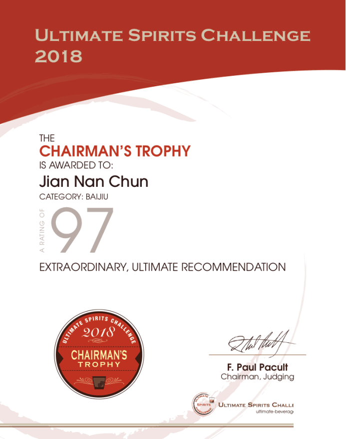 “終極烈酒挑戰(zhàn)賽”(Ultimate Beverage Challenge)被譽為國際上最具權威的三大烈酒比賽之一,在2018年 “美國終極烈酒挑戰(zhàn)賽”(ULTIMATE SPIRITS CHALLENGE)上,中國白酒共有50多款被選送并獲得了不俗成績。其中,劍南春以97分(滿分100分)的好成績,榮獲最高獎“主席獎杯” (CHAIRMAN’S TROPHIES),讓全世界的品酒師為中國傾倒,同時也位列參賽的中國白酒產(chǎn)品第一名。