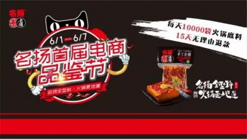 而其實早在今年6月,成都揚名食品就開啟了為期一周的“名揚火鍋品鑒節(jié)”。依托天貓平臺,擲一千萬資金舉辦品鑒節(jié),回饋消費者,在品鑒節(jié)期間,在天貓名揚食品旗艦店上購買火鍋底料均可在15天內(nèi)退款不退貨。除此之外,還在成都寬窄巷子有趣味送火鍋底料的活動,全型料知識科普、表演、游戲,還有精美禮品相送。