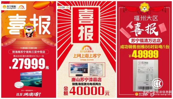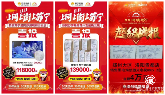 雙十一開啟后,杭州慶春蘇寧率先售出188888元的創(chuàng)維100吋天幕電視。隨后全國各地的蘇寧門店開啟了拼土豪模式,天津蘇寧南樓店售出99999元的索尼OLED電視77A1,洛陽貴都店售出100000元索尼85X9000F兩臺,杭州塘棲鎮(zhèn)精選店售出兩臺夏普80吋大屏彩電,蘇寧浦東第一店售出創(chuàng)維壁紙電視65W9一臺,唐山蘇寧灤縣店售出海信激光電視兩臺……