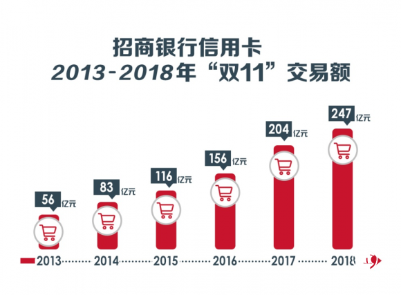 時間倒回到2013年,彼時天貓“雙11”正式迎來5周年。招行信用卡數(shù)據(jù)顯示,也就是在這一年,招行信用卡“雙11”交易額突破50億元,相比同期大幅增長。接下來幾年,其“雙11”交易額加速提升,2015年破百億,2017年突破200億元;今年,交易額更是高達247億元。