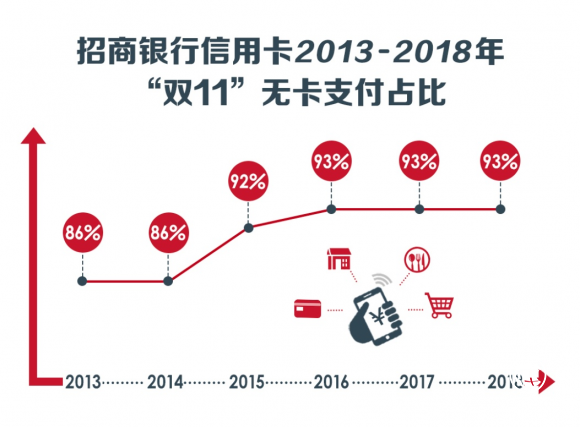 5年間,信用卡也在不斷加速無卡支付進程,招行信用卡數(shù)據(jù)顯示,2013年—2017年雙11無卡支付比例均高居85%以上,而在2011年這個數(shù)字才62%。今年“雙11”,招行信用卡無卡支付占比高達93%。