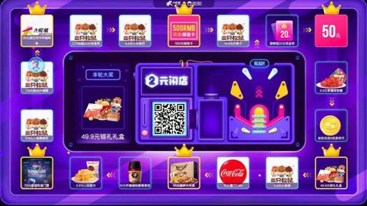 雙11當(dāng)天,哈爾濱西城紅場迎來了10萬人,南京印象匯涌入6萬人,深圳龍崗萬科廣場也有6.5萬客流入場。而這些人大多數(shù)涌向了商場的一樓中庭,體驗(yàn)強(qiáng)娛樂交互產(chǎn)品——2元閃店。它如同一個(gè)玲瑯滿目的吃喝玩樂展示柜,消費(fèi)者可利用自己累計(jì)的積分參與活動。高清大屏掃碼參與,用200積分或充值2元即可開玩,隨機(jī)獲得iPhoneXS Max、戴森吹風(fēng)機(jī)、大牌口紅,商戶優(yōu)惠券等,最大限度簡化消費(fèi)者獲取需求的門檻,人人參與、即時(shí)開獎,以超低價(jià)獲得價(jià)值感和娛樂感。