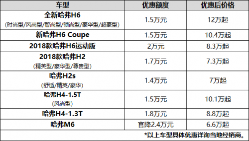 哈弗的這波優(yōu)惠幅度空前。其中,哈弗M6官降2.4萬元,僅售6.6萬元起,成為一線品牌中唯一一款價位下探至7萬級的緊湊級SUV。哈弗H6運動版優(yōu)惠2萬元,僅售8.3萬元起。也就是說,只需要8.3萬元,用戶就能買到中國最暢銷的這款SUV。此外,全新哈弗H6、新哈弗H6 Coupe、哈弗H4、哈弗H2,分別優(yōu)惠1.4-1.8萬元不等,可謂全面優(yōu)惠、真情可鑒。