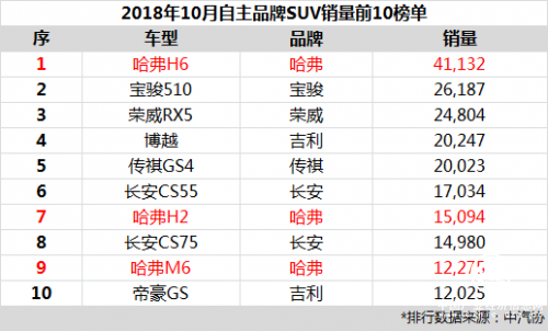 哈弗H6、H2、M6霸榜,自主SUV前十獨占三席