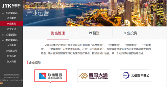 在2013年聚益科對中國未來社會的經(jīng)濟形勢做出了充分研究,將財富管理業(yè)務(wù)作為未來集團戰(zhàn)略發(fā)展的重點。與其同時,風險投資、礦業(yè)投資、財富管理三大板塊并駕齊驅(qū),為企業(yè)發(fā)展提供強大推動力。十多年來, 聚益科經(jīng)營范圍涵蓋了財富管理、礦產(chǎn)、新能源、互聯(lián)網(wǎng)及生物醫(yī)藥等多個領(lǐng)域,投資20多個大型投行項目,與多家知名企業(yè)進行“投行副駕駛”模式的投資與合作,擁有價值千億元山東三山島北部海域金礦和甘肅加甘灘金礦?,F(xiàn)聚益科擁有券商、公募、私募等金融類牌照,金融版塊資產(chǎn)管理規(guī)模達1500億元。