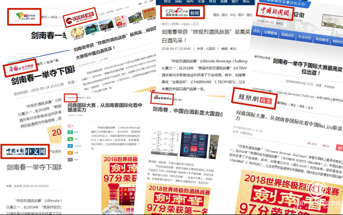 以此同時(shí),新浪、網(wǎng)易、鳳凰網(wǎng)、中國新聞網(wǎng)等200多家主流媒體也紛紛報(bào)道,對(duì)劍南春獲獎(jiǎng)高度評(píng)價(jià),引發(fā)全民熱議,一度形成刷屏之勢!
