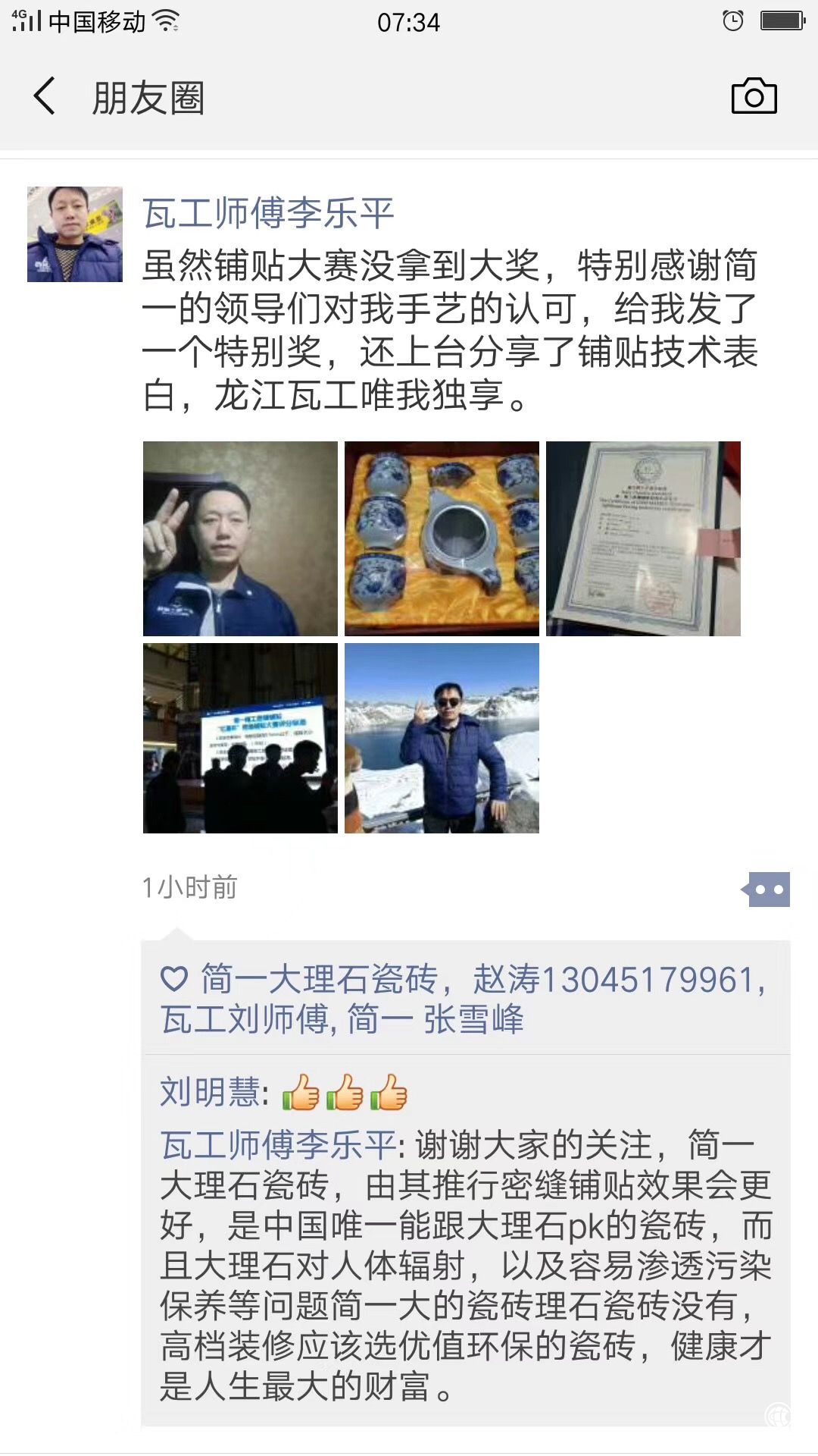 他認(rèn)為簡(jiǎn)一大理石瓷磚的密縫鋪貼效果好,“是中國(guó)唯一能跟大理石PK的瓷磚”,他在微信發(fā)朋友圈說(shuō),“簡(jiǎn)一大理石瓷磚沒(méi)有大理石對(duì)人體輻射、以及容易滲透污染、保養(yǎng)等問(wèn)題,高檔裝修應(yīng)該選優(yōu)植(質(zhì))環(huán)保的瓷磚,健康才是人生最大的財(cái)富。”