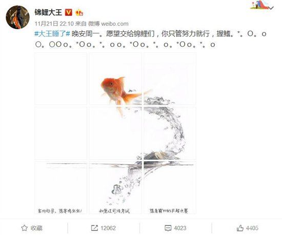 現(xiàn)實的無奈,讓很多的人在努打拼之余,渴望“幸運”的一點點加持。正如@錦鯉大王的賬號簡介中所言:“愿望交給錦鯉,你就只管努力”。