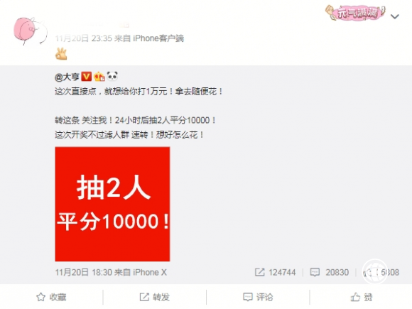 “全民星大獅”窗外***萬(wàn)雀分享過(guò)自己的經(jīng)驗(yàn),“自己平時(shí)有相關(guān)的抽獎(jiǎng)活動(dòng),都會(huì)去轉(zhuǎn)發(fā)一下,反正只是在微博轉(zhuǎn)發(fā)一下而已,也不費(fèi)什么功夫。后面能做的就是靜靜地等待。”