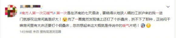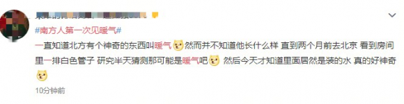 今天,“南方人第一次見暖氣”竟然爬上了微博熱搜。暖氣里面是水,不是氣?南方人對此表示一臉不解和好奇。有南方網(wǎng)友說,一直以為暖氣是從屋子外面用一根管子放熱乎氣進來,還有網(wǎng)友第一次見暖氣后納悶墻上干嘛釘一個折疊床……各種奇特反應(yīng)令人捧腹。