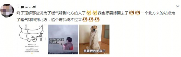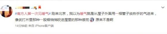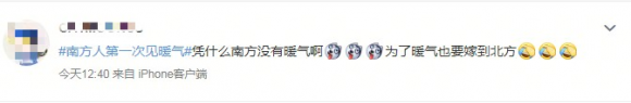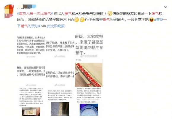 北方人則一臉傲嬌,還分享出暖氣玩法攻略,比如,樓上樓下鄰居太吵鬧,可以迅速用扳手敲擊自家暖氣管以示抗議;暖氣管可以熱牛奶,烘襪子,烤紅薯片,熱面膜……