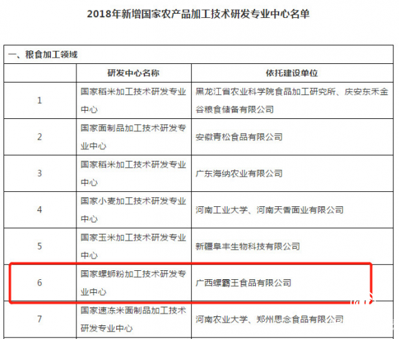 2018年11月16日,2018年國(guó)家農(nóng)產(chǎn)品加工技術(shù)研發(fā)體系新增專業(yè)中心授牌儀式正式在南京國(guó)際博覽會(huì)議中心舉行。來(lái)自廣西柳州的廣西螺霸王食品有限公司,榮獲了農(nóng)業(yè)部授予的“國(guó)家螺螄粉加工技術(shù)研發(fā)專業(yè)中心”牌匾,正式成為全國(guó)唯一一個(gè)領(lǐng)取此項(xiàng)殊榮的螺螄粉企業(yè)。