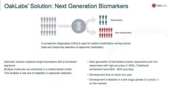 項目方提出了創(chuàng)新解決方案,將多種分子組成生物標(biāo)記物,取代單一的生物標(biāo)記物,為整個藥物開發(fā)過程提供極高的精確度。項目的創(chuàng)新之處在于引入人工智能和機(jī)器學(xué)習(xí)技術(shù),大幅度提升生物標(biāo)記物的準(zhǔn)確度,準(zhǔn)確預(yù)測響應(yīng)和非響應(yīng)者,從現(xiàn)有技術(shù)的65%~80%提高到90%以上。